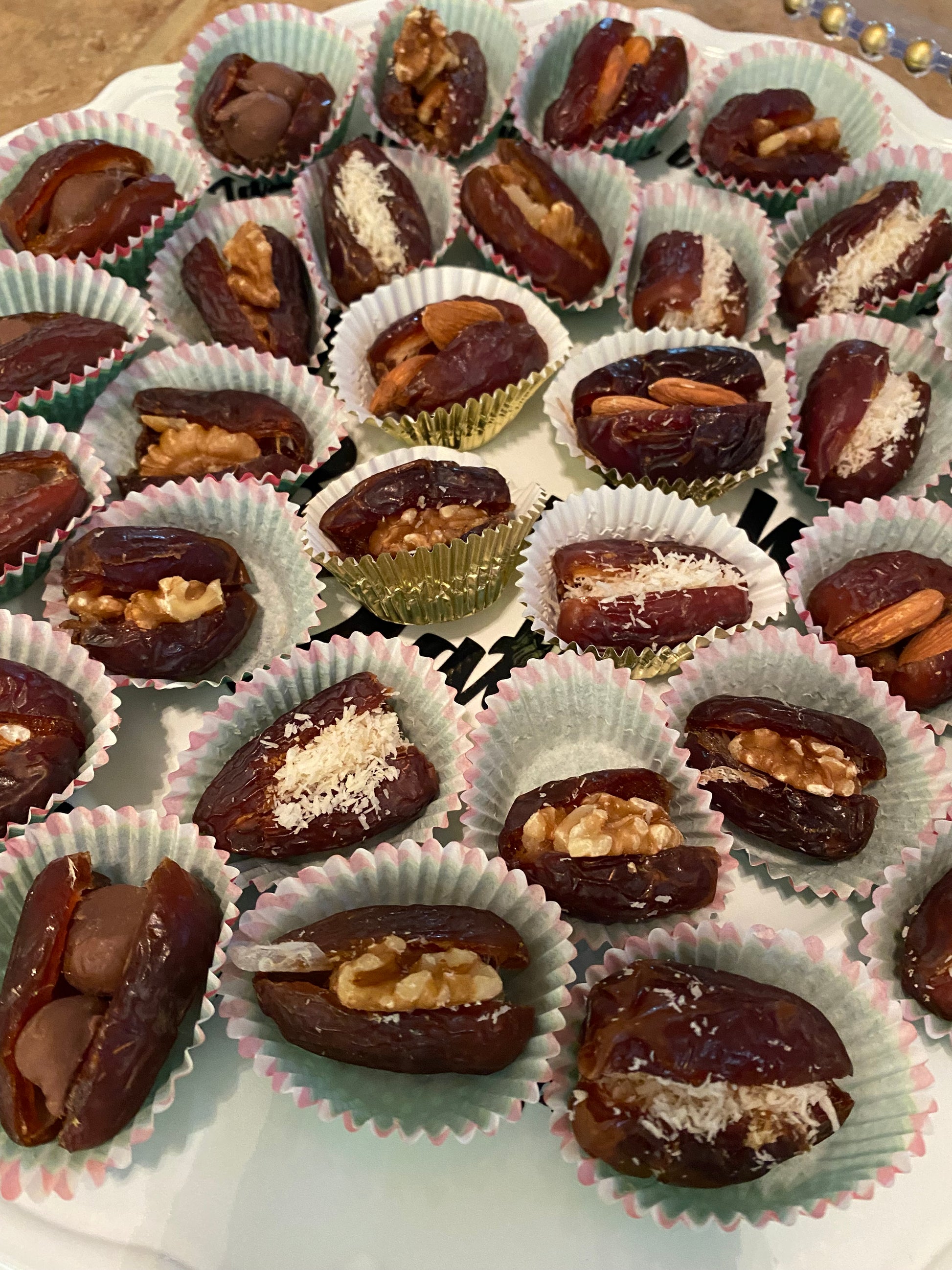 A beautiful platter filled with assorted stuffed dates