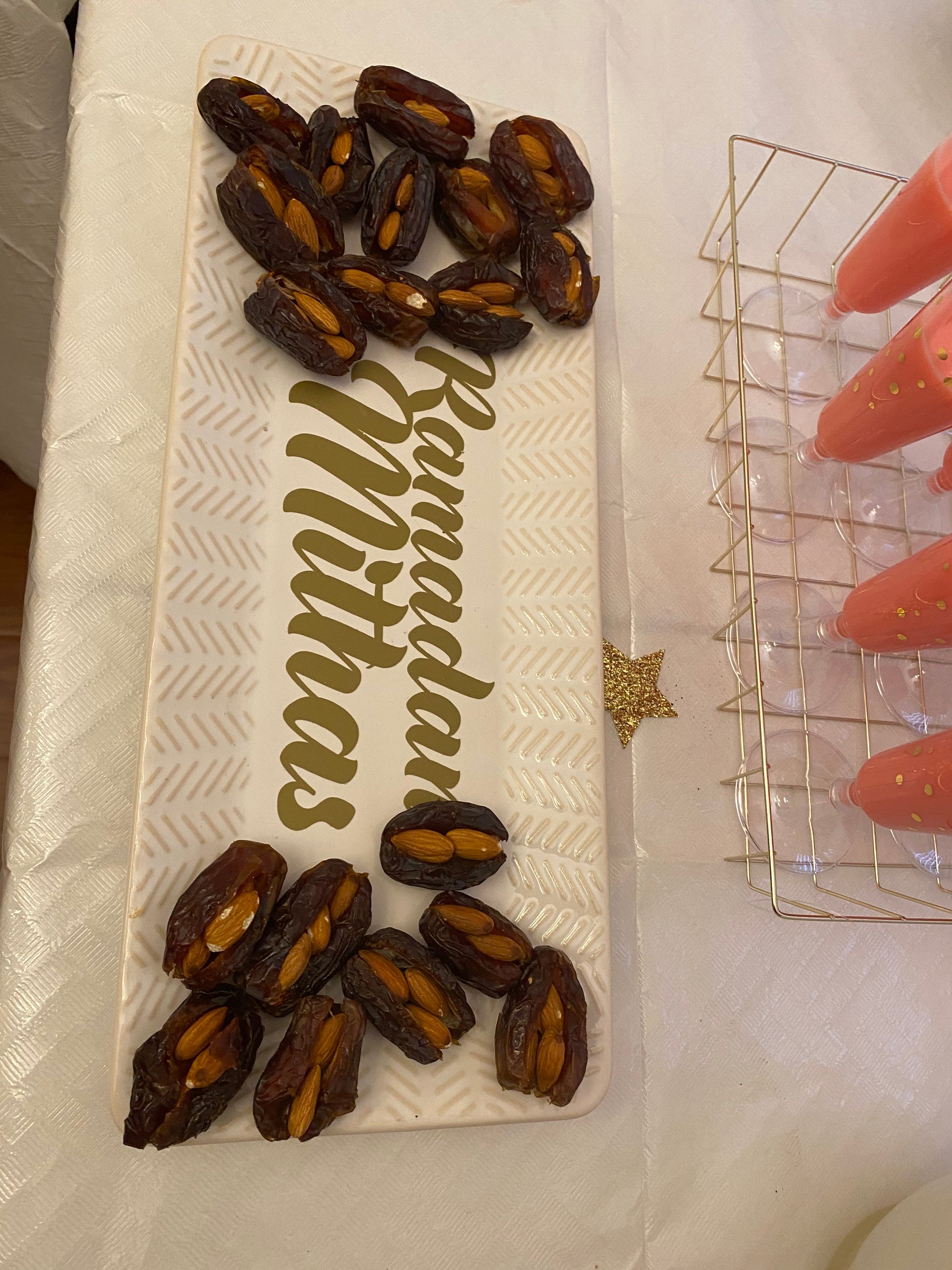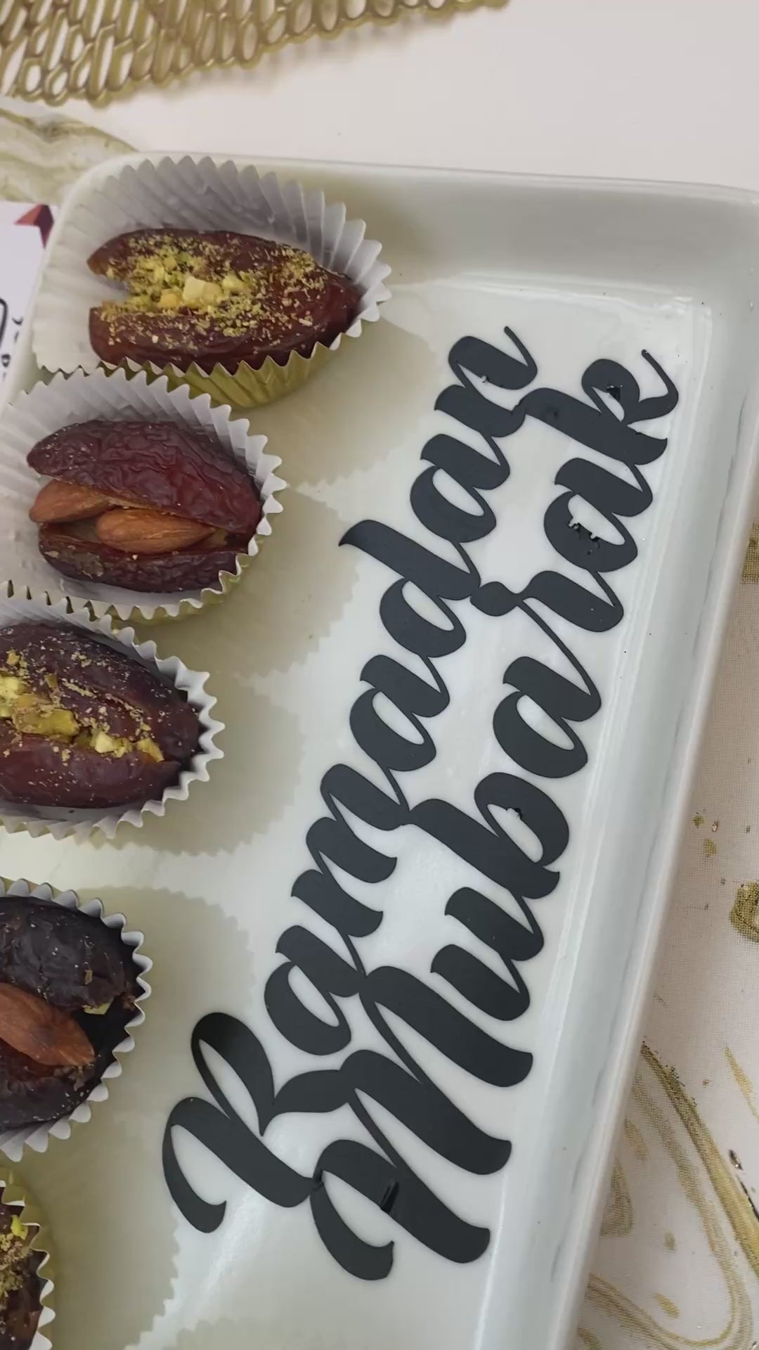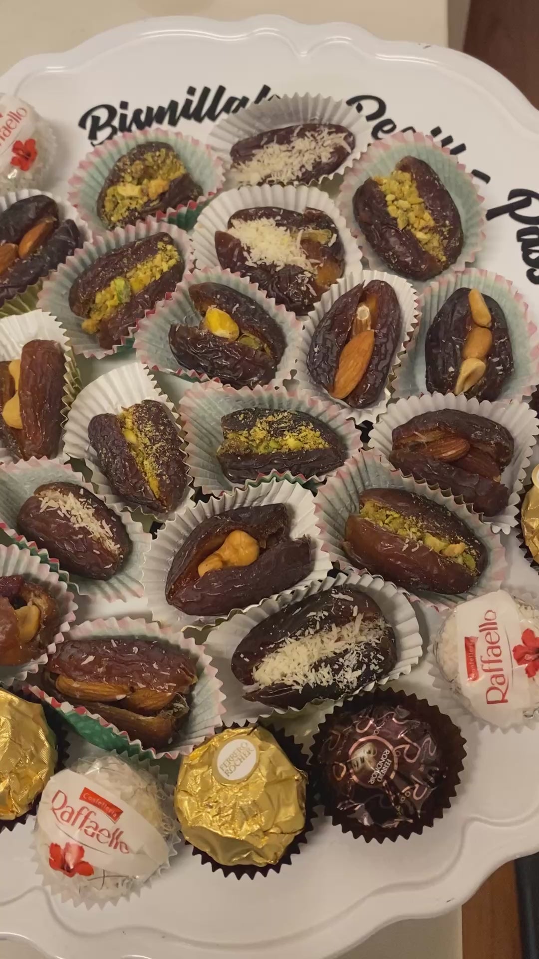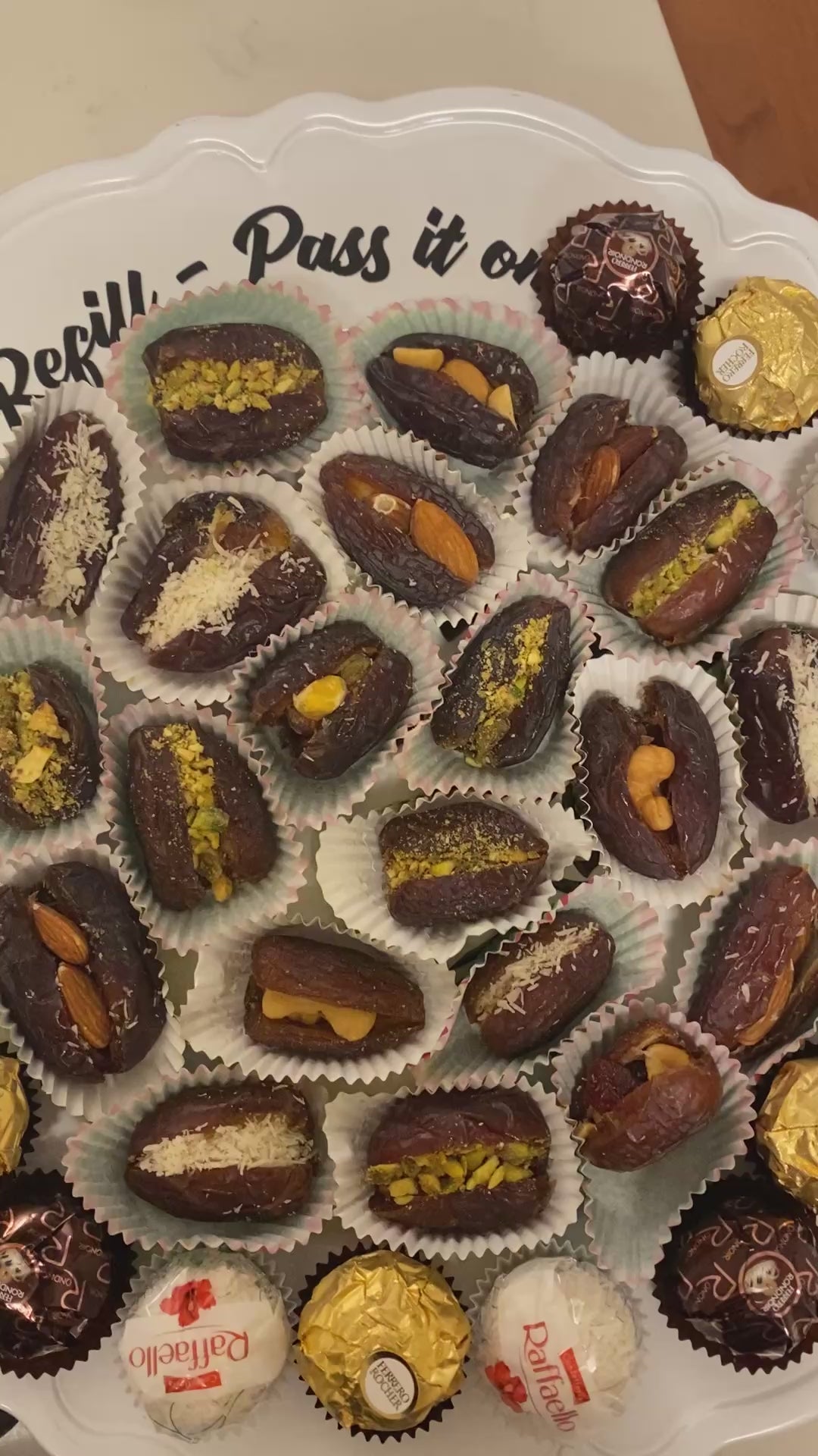 All platters are filled with assorted stuffed dates.